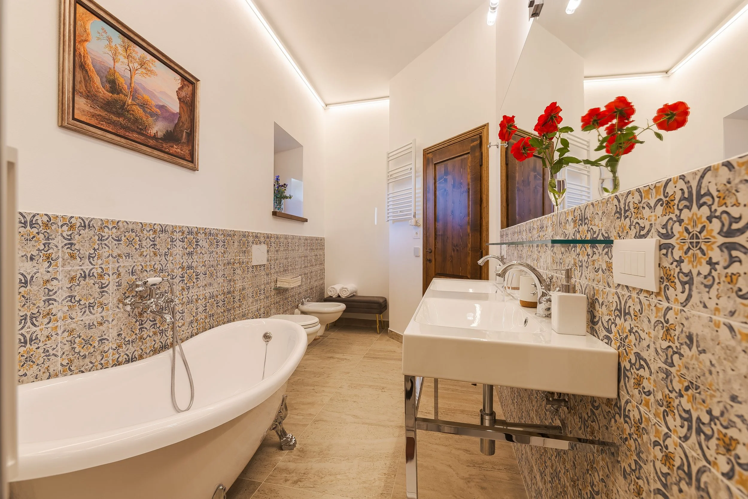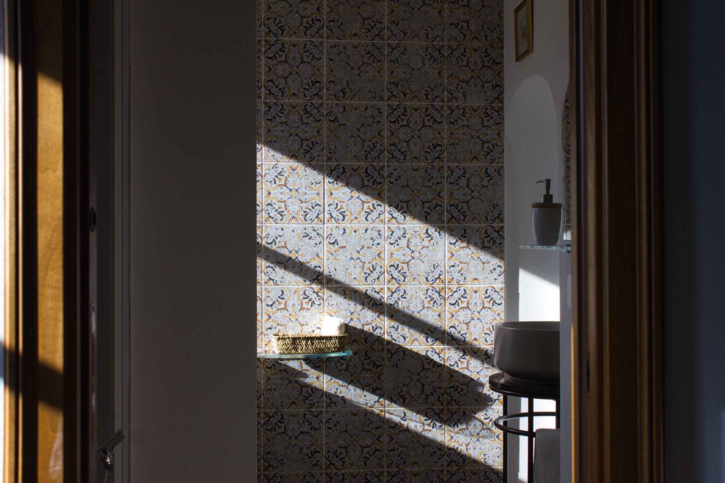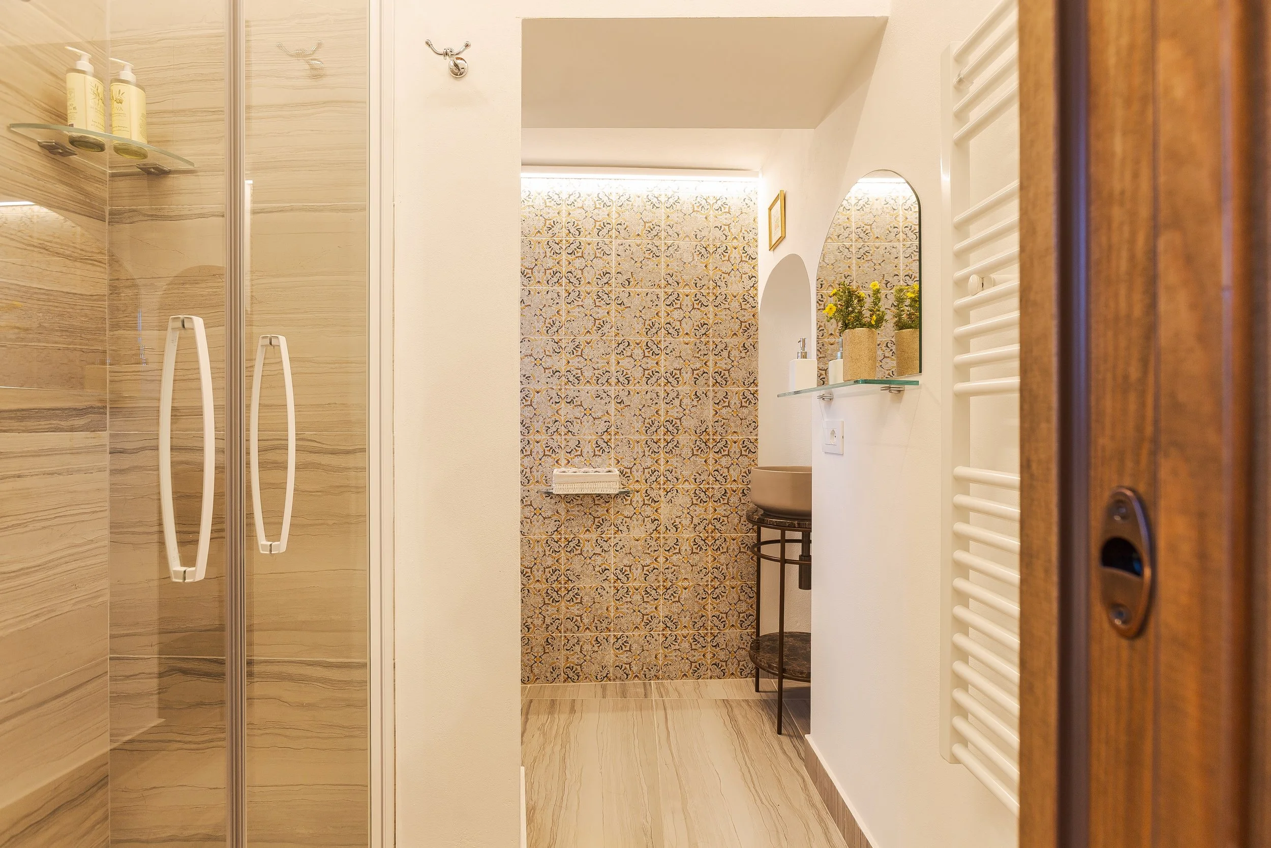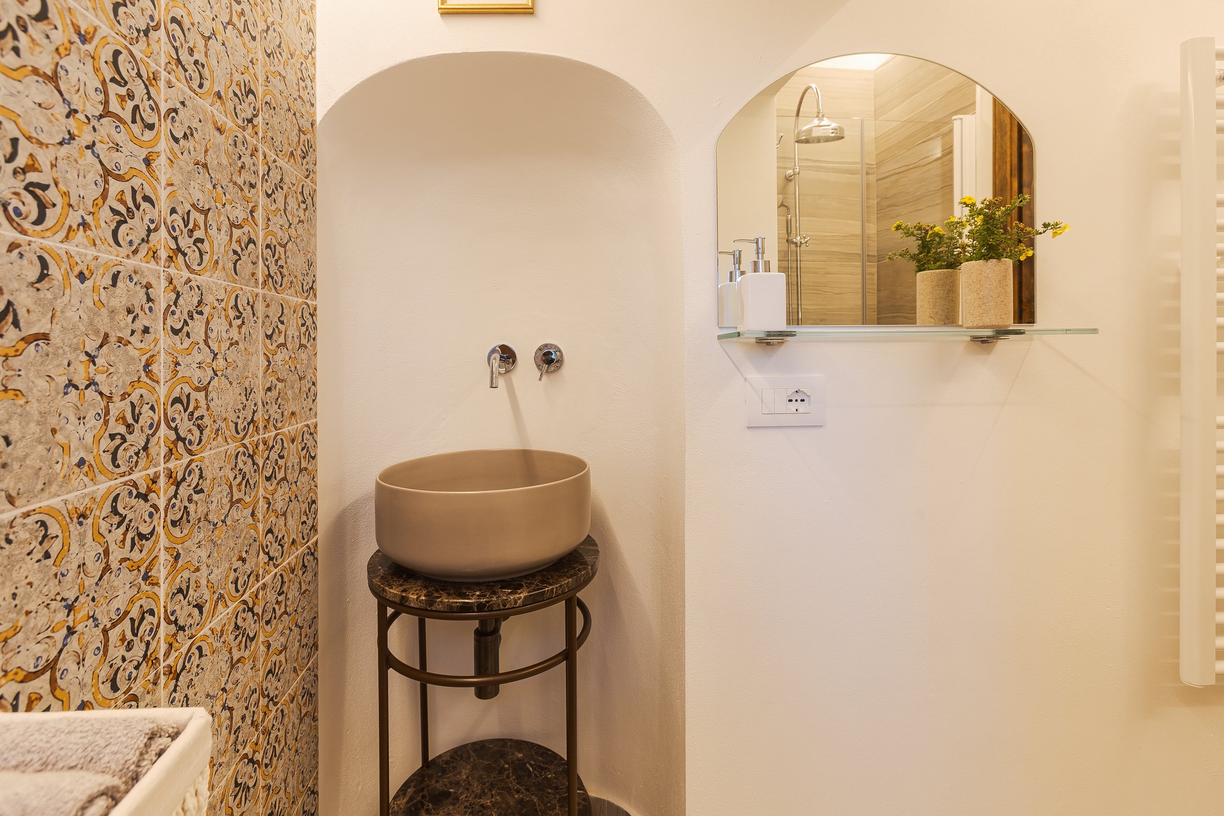 Camera Rosa is a romantic pink room with century-old restored ceiling and floors. It includes a charming Romeo and Juliet balcony with stunning panoramic views, while the bathroom features elegant handmade black and white tiles for a stylish contrast.