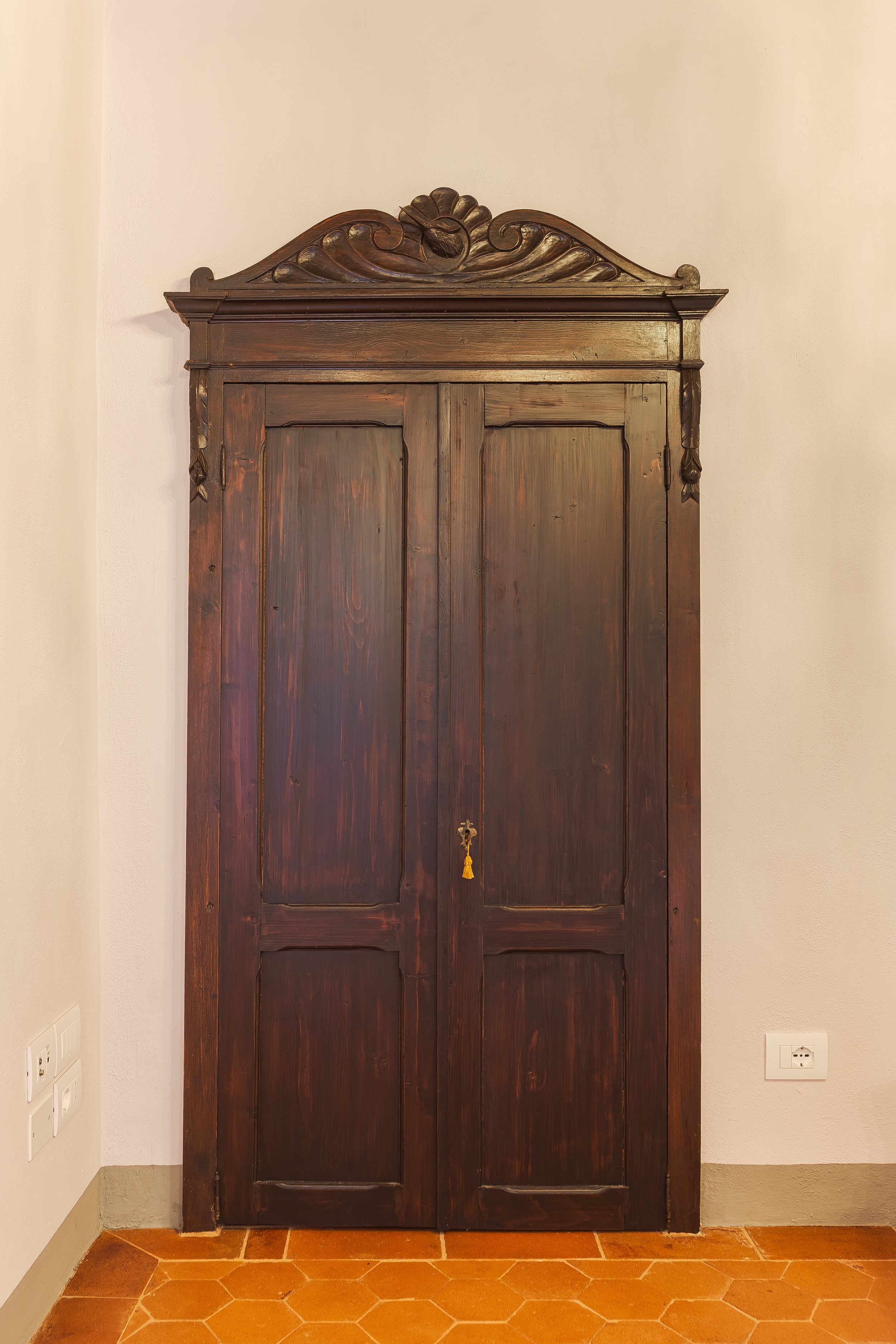 Camera Avorio is a grand, spacious room with three large windows showcasing stunning views. It features antique-style wooden ceilings, furniture, handmade tile flooring, and an ancient door that opens to a large garden.